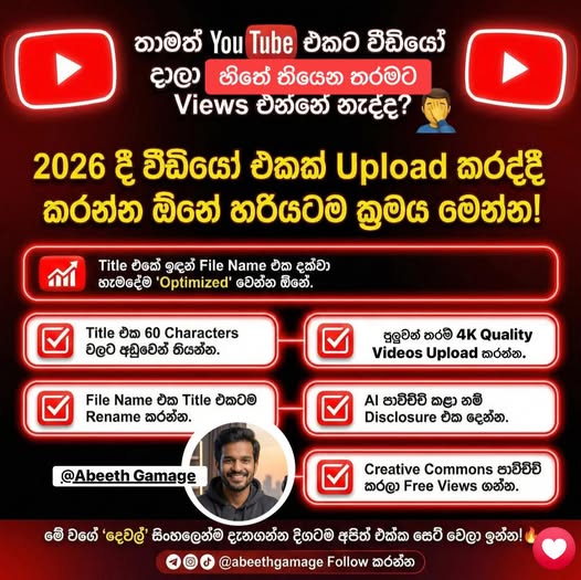 දැන් 2026 වෙද්දී YouTube එකේ AI එක හරිම Advanced. ඔයාගේ Thumbnail එකේ තියෙන රූප සහ වචන, ඔයාගේ Title එකත් එක්ක සැසඳෙන්න ඕනේ. Thumbnail එකේ “Money” කියලා තියෙනවා නම්, Title එකෙත් ඒ වචනය තියෙන්න ඕනේ. එතකොට තමයි YouTube එකට පැහැදිලි වෙන්නේ මේක “Quality Content” එකක් කියලා. දැන් Google මාර Advance නිසා මේව Ai වලින් Detect වෙනව ඉක්මනටම