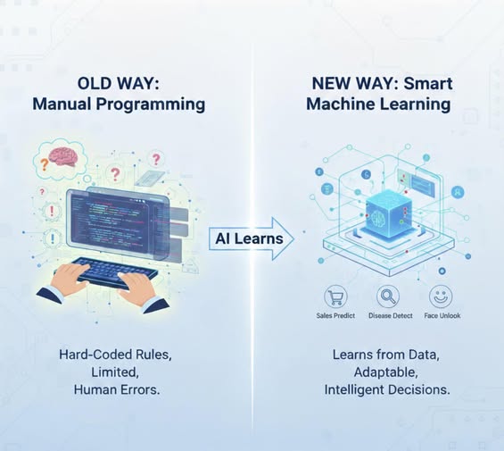 සරලවම කිව්වොත්, මීට කලින් අපි කම්පියුටර් එකකට වැඩක් කරගන්න නම් ඒකට කරන්න ඕන හැමදේම “Rules” විදිහට ටයිප් කරලා දෙන්න වුණා. හැබැයි Machine Learning වලදී වෙන්නේ, කම්පියුටර් එකට දත්ත (Data) ලබා දුන්නම, ඒ දත්ත දිහා බලලා තමන්ගේ අත්දැකීමෙන් තනියම ඉගෙනගෙන තීරණ ගන්න එකයි.